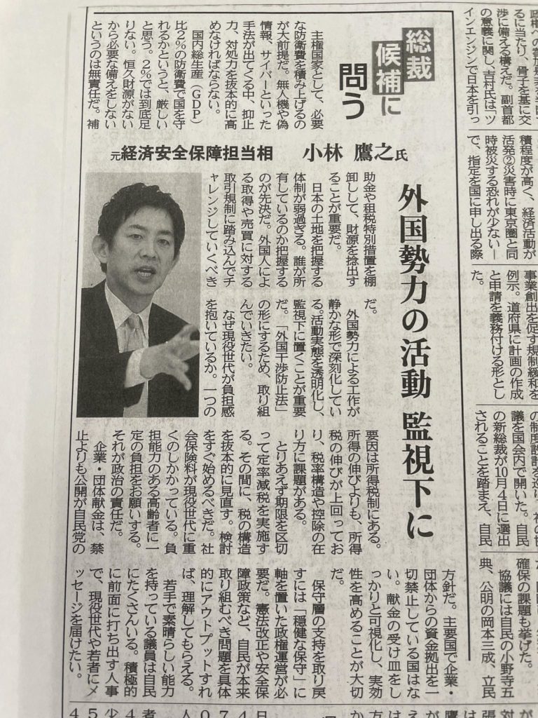 今朝の地元紙東奥日報に、小林鷹之候補の考えが掲載されています。