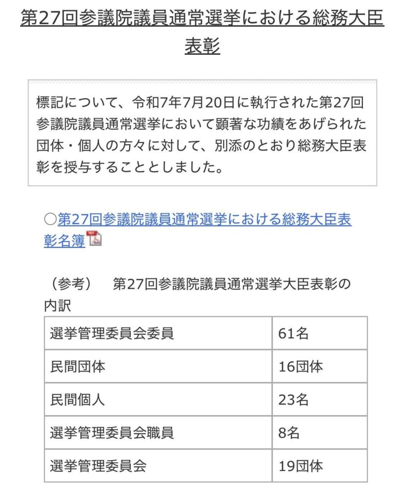 これは、昨年の第27回参議院議員選挙で投票率向上につながる優れた取り組みを行った選挙管理委員、自治体、民間団体を表彰するものです。