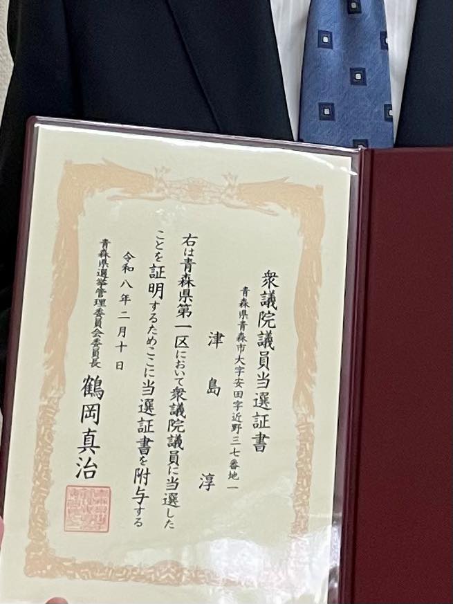 2026年2月11日 / 最終更新日 : 2026年2月11日 kawamura 活動報告 当選証書をいただきました 第51回衆議院議員総選挙に当選した証をいただきました。 一票一票の積み重ねの重みを感じ身が引き締まります。 #つしま淳#青森を強く豊かに#衆院選あおもり#青森の声を届けます Follow me! 皆様の声を自分の思いとして政府・自民党に届けてまいります。私は常にクリーンな政治を心掛けています。 ご意見・お問い合わせ FacebookXCopy