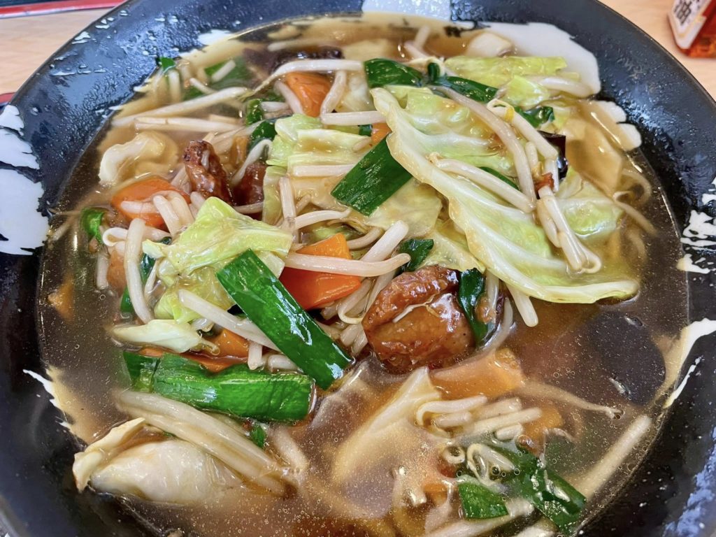 レバニラ炒めはレバーがゴロゴロ入り食べ応えあり、その具材とちょい甘めのスープと細麺がよく絡み、絶妙な味わいとなります。